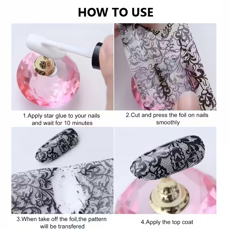 This set includes a box of 10 rolls of Black and White Lace Floral Nails Foils, and 2 bottles of glue gel which is needed for these foils.
