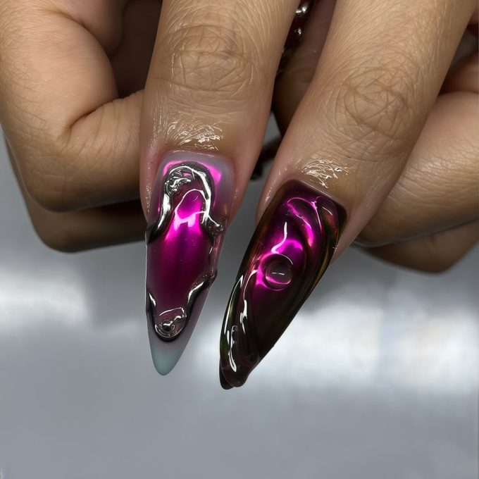 Bloody Chrome is a daring press-on nail set created for those drawn to high-impact artistry and fierce, metallic drama. Set on a deep matte noir base, the collection showcases molten chrome streaks dripping in vivid crimson, evoking the intensity of liquid metal fused with raw, visceral energy. Razor-sharp reflections, mirrored 3D accents, and blood-red gradients heighten the bold aesthetic, transforming the set into a powerful fusion of industrial edge and unapologetic dark glamour.