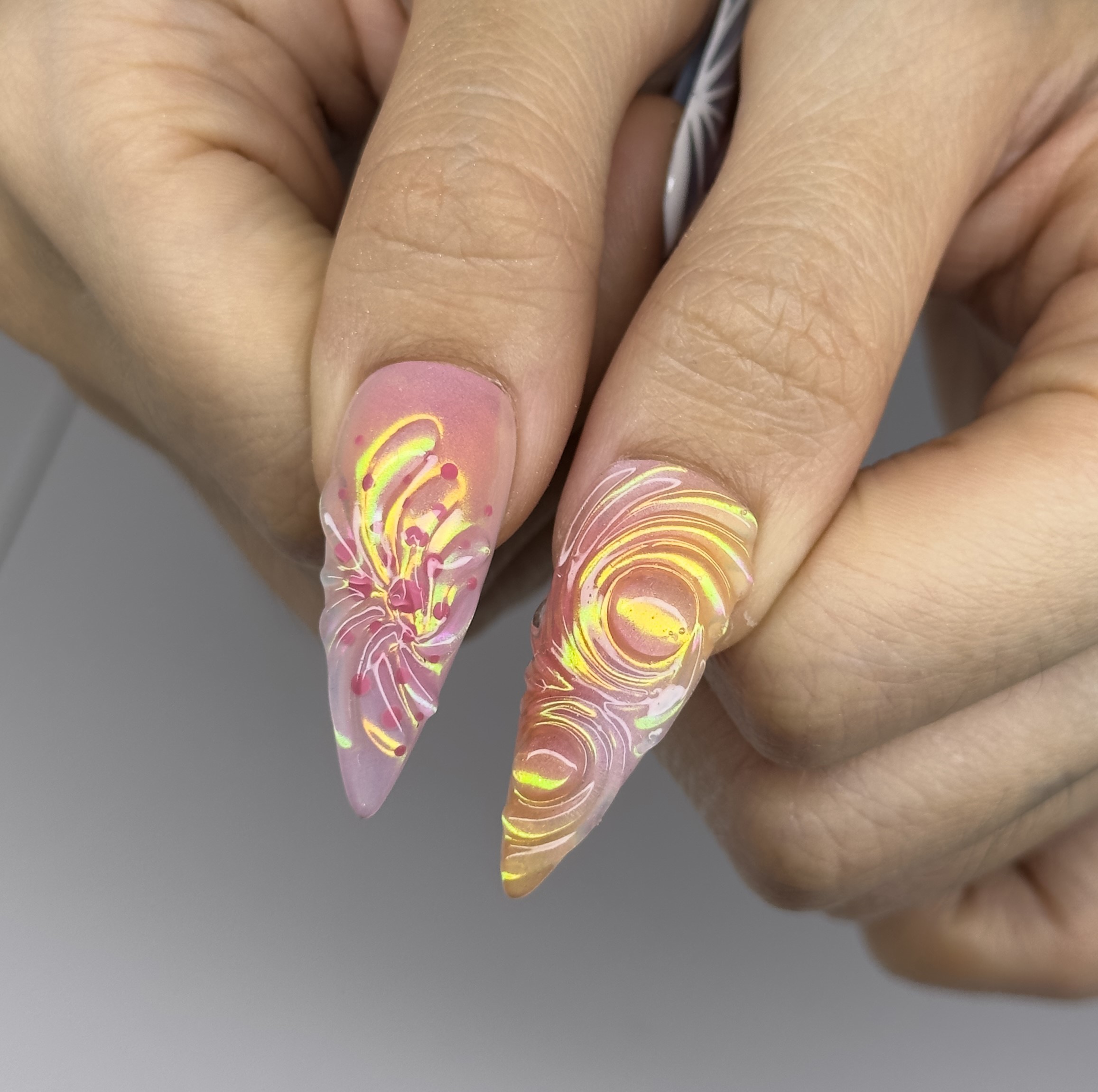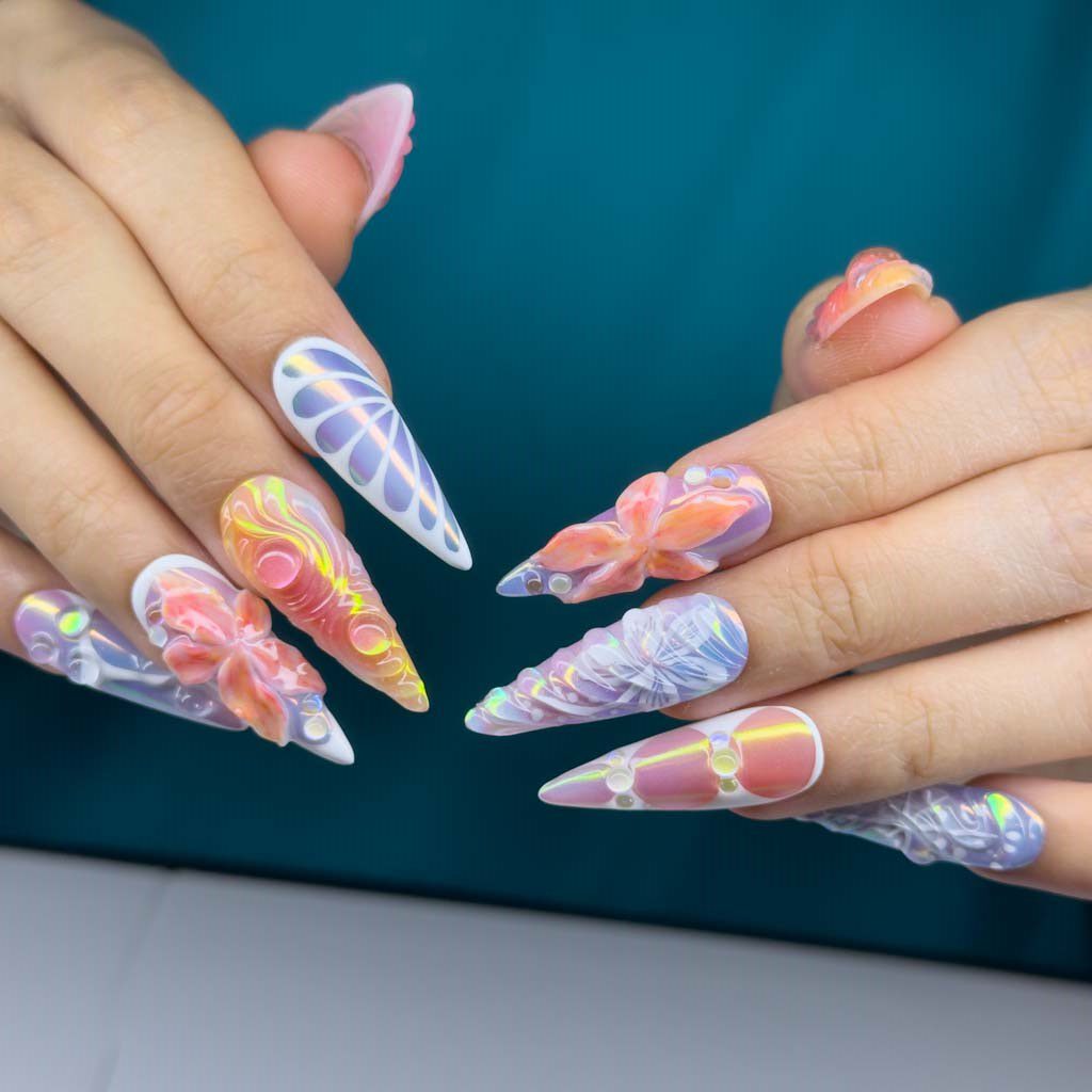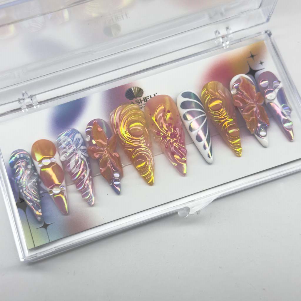 Dream Weave là bộ móng tay dán lý tưởng cho vẻ ngoài rực rỡ và nghệ thuật. Bộ sản phẩm này sở hữu lớp sơn óng ánh rực rỡ, chuyển màu, tỏa sáng với các sắc cam, vàng và hồng. Thiết kế bao gồm những đường xoáy uốn lượn điêu khắc và họa tiết hoa trừu tượng, tựa như một tấm vải dệt đầy mê hoặc, siêu thực. Bộ sản phẩm này là một tuyên ngôn thời trang cao cấp, hoàn hảo cho bất kỳ ai yêu thích vẻ đẹp độc đáo và tương lai.