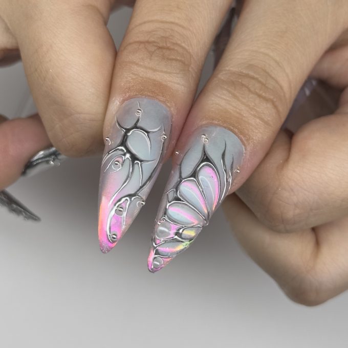 Enchanted Heartstrings là mẫu móng tay dán yêu thích của bạn, mang đến vẻ ngoài thanh thoát và lãng mạn đậm chất tương lai. Bộ móng này nổi bật với lớp nền ngọc trai lấp lánh cùng những đường nét bạc uốn lượn mềm mại như ren tinh xảo hay những sợi dây ma thuật. Được tô điểm bằng hình trái tim óng ánh tuyệt đẹp, lấp lánh sắc màu, thiết kế này là sự kết hợp hoàn hảo giữa nét lãng mạn tinh tế và phong cách hiện đại.