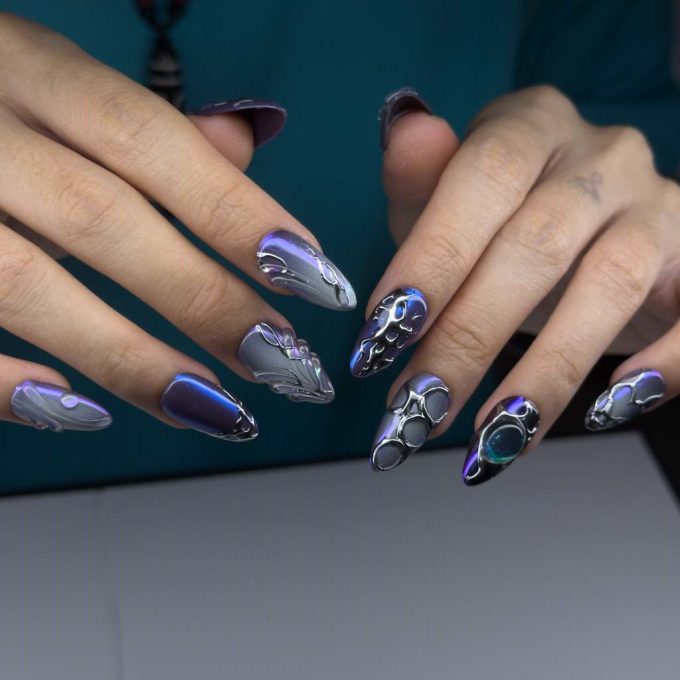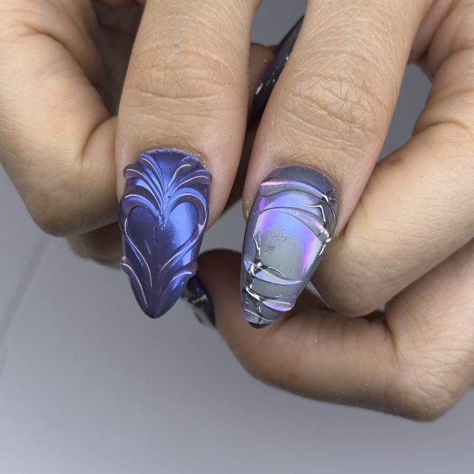 Enchanted Nebula là bộ móng tay dán hoàn hảo cho vẻ ngoài ấn tượng, lấy cảm hứng từ khoa học viễn tưởng. Bộ móng này sở hữu lớp sơn óng ánh, chuyển màu với các sắc thái tím đậm và xanh lam. Với sự kết hợp giữa crôm kim loại lỏng điêu khắc và họa tiết vũ trụ trừu tượng, đây là một bộ móng táo bạo và bí ẩn, sẵn sàng cho một cuộc phiêu lưu vũ trụ.