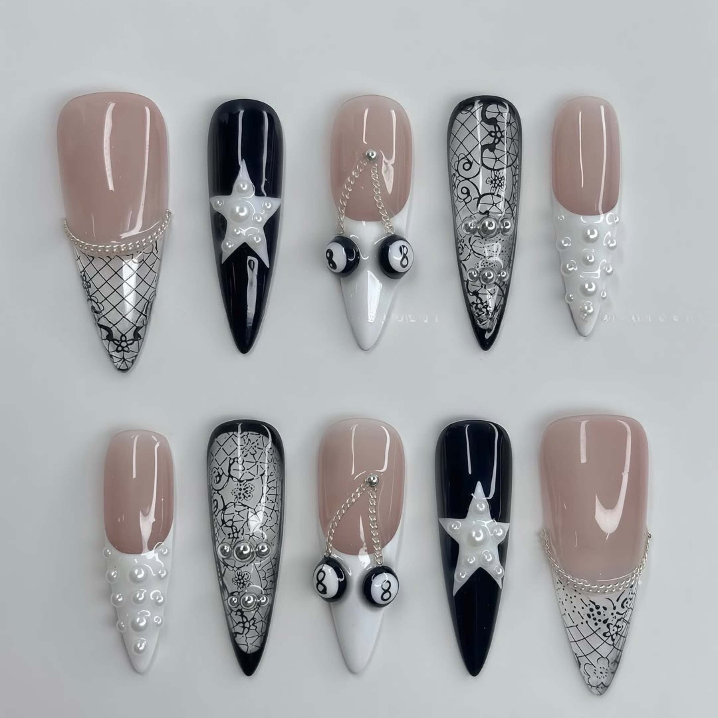 Goth-Lace Muse is an exquisite press-on nail set crafted for those who adore rebellious elegance. Featuring a dynamic mix of stark black and soft nude bases, the design showcases intricate lace patterns, bold stars, and playful 8-ball charms accented by delicate silver chains and pearl details. This set transforms into a luxurious fusion of dark romance and sophisticated street style.