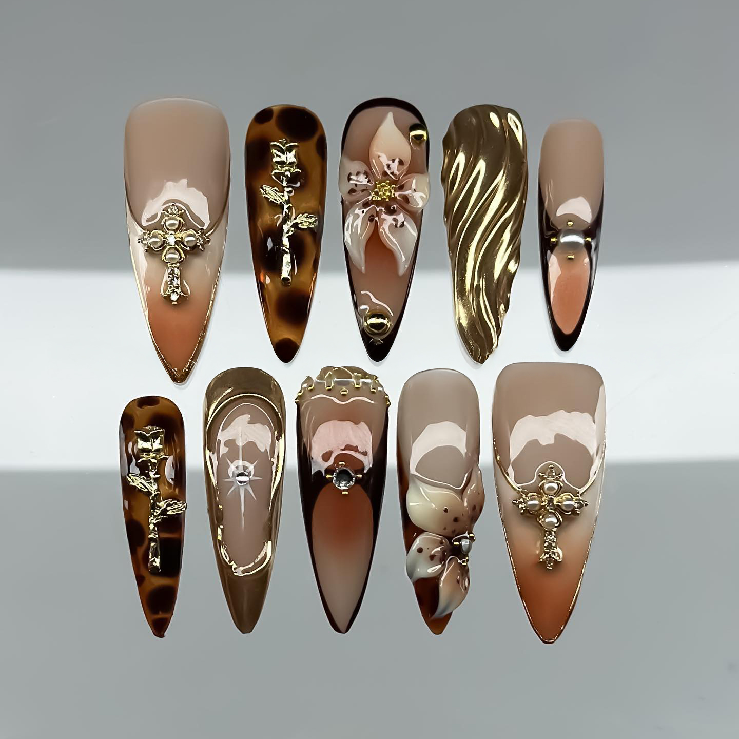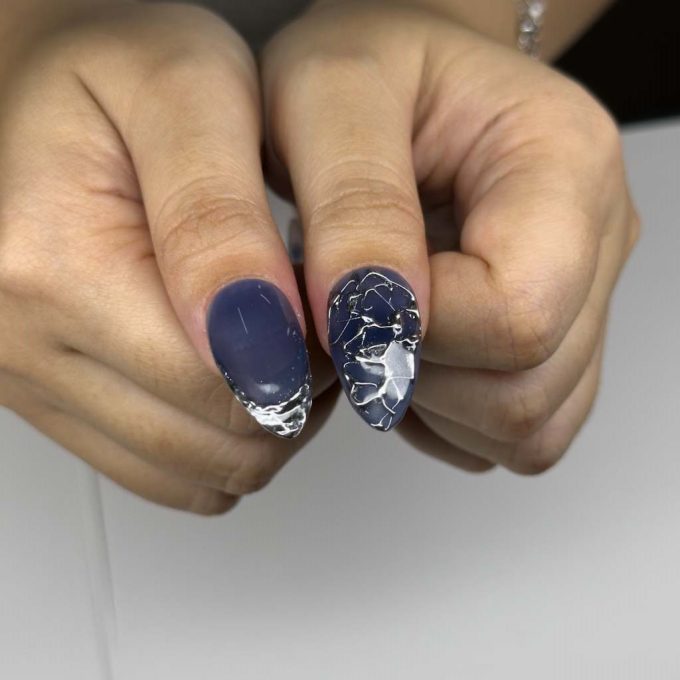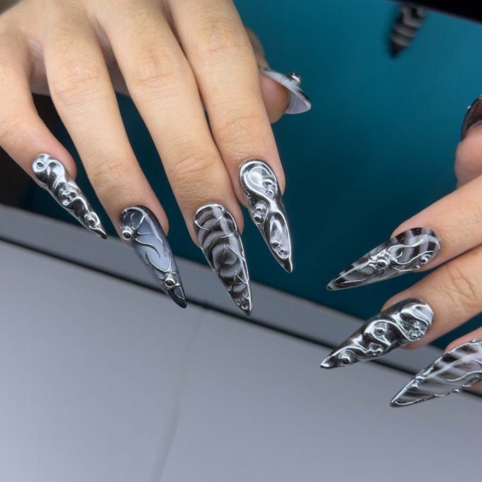 Gothic Glitch là mẫu móng tay dán yêu thích của bạn, mang đến vẻ ngoài táo bạo và cá tính với chút hơi hướng công nghiệp tối màu. Bộ móng này nổi bật với bảng màu đơn sắc ấn tượng gồm đen và xám, điểm xuyết những chi tiết bạc ánh kim tinh xảo. Được tô điểm bởi hình thánh giá bạc chạm khắc, lớp mạ crôm trừu tượng và họa tiết đứt gãy độc đáo, đây là một thiết kế thời trang cao cấp và phá cách, hoàn hảo để tạo điểm nhấn.