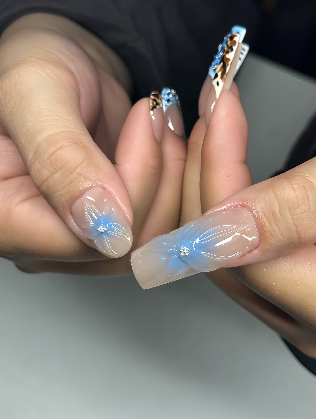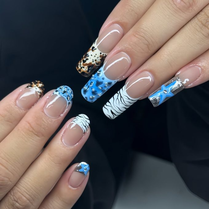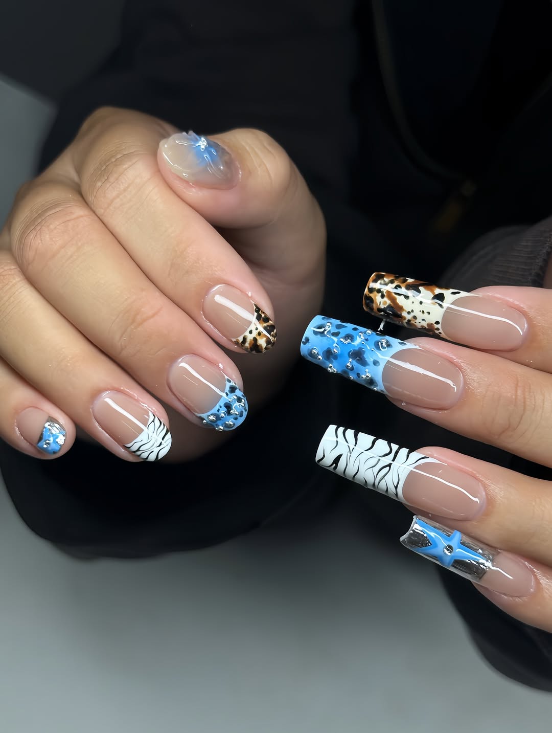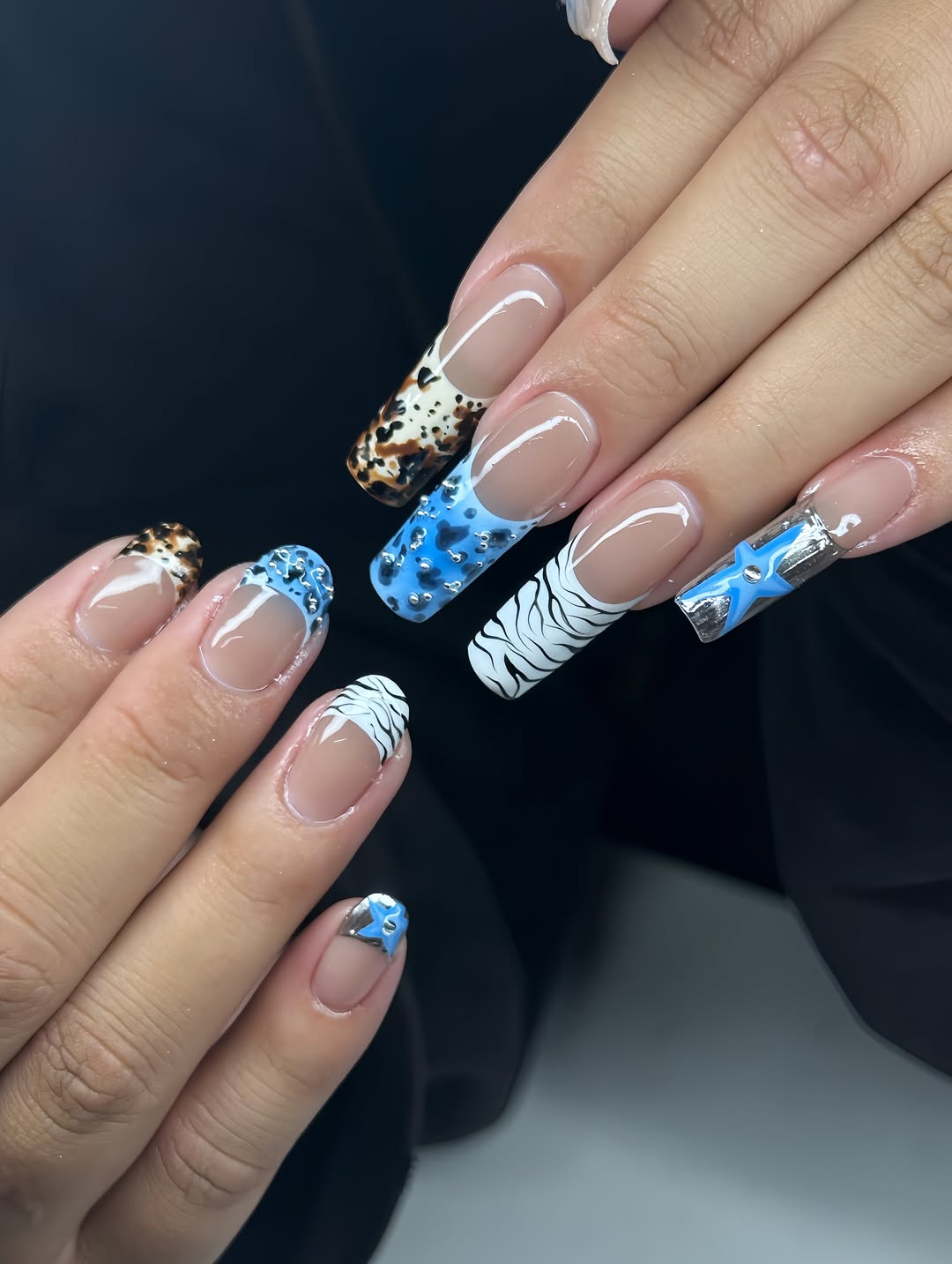 “Jungle French” is an exquisite press-on nail set crafted for those who adore modern eclectic flair. Featuring a classic sheer nude base and crisp French V-tips, the design boldly contrasts timeless elegance with wild patterns. The tips are finished in a mix of zebra stripes, leopard spots, and vibrant blue gel, accented by high-gloss silver chrome and clusters of blue rhinestones. This collection transforms into a luxurious fusion of daring, graphic artistry and playful, high-fashion sophistication.