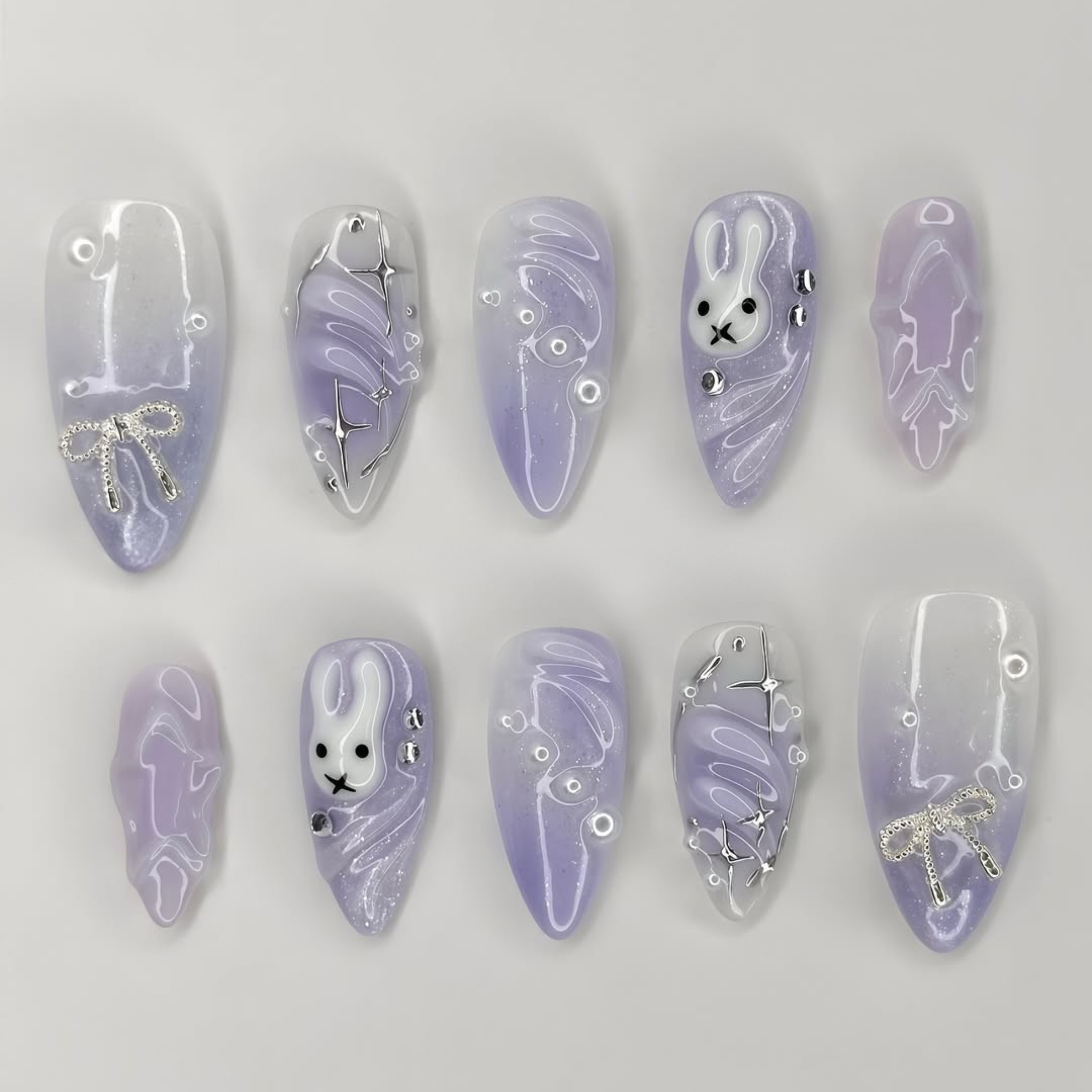 “Lavender Bunny” is an exquisite press-on nail set crafted for those who adore whimsical fantasy. Featuring a delicate ombre blend of translucent white and dreamy lavender purple, the design showcases soft, shimmering swirls, subtle glitter dust, and charming 3D bunny heads. The set is accented with fluid silver chrome bows, tiny stars, and pearl-like studs, transforming it into a luxurious fusion of soft, ethereal artistry and sweet, playful sophistication.