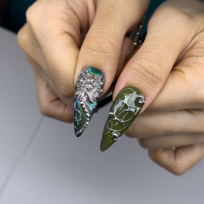 Mystic Swamp là bộ móng tay dán yêu thích của bạn, mang đến vẻ ngoài tối giản, trầm ấm pha chút huyền bí. Bộ móng này nổi bật với lớp nền xanh ô liu óng ánh, lấp lánh dưới ánh sáng huyền ảo. Được trang trí bằng lớp mạ crôm kim loại lỏng điêu khắc và họa tiết xoáy hữu cơ, thiết kế táo bạo và bí ẩn, toát lên vẻ đẹp mê hoặc của một đầm lầy ẩn giấu.