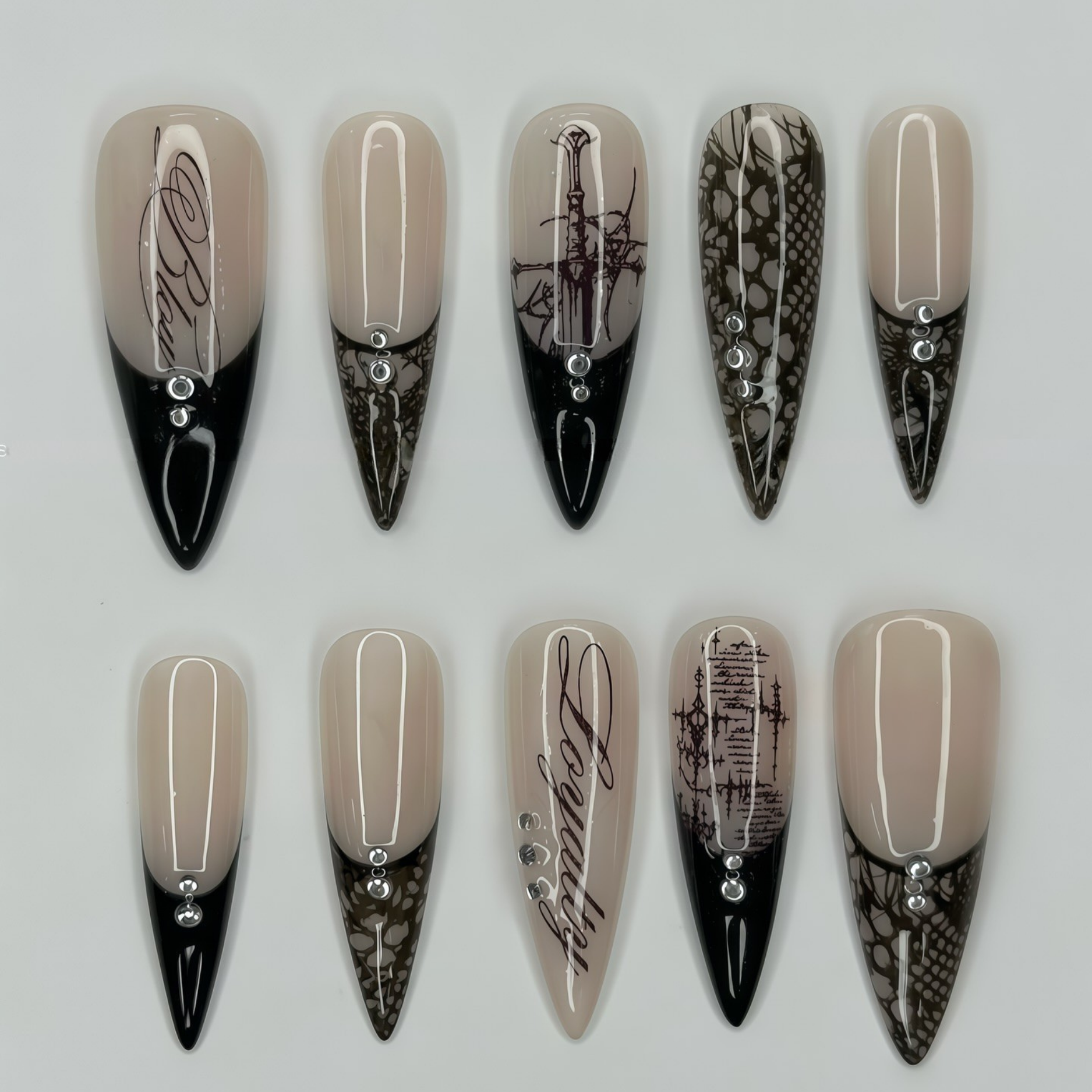 Every nail tells a story of commitment and mystery. With the bold “Loyalty” calligraphy and protective sigil art, this design transforms the classic Almond shape into a canvas of dark romance and unbreakable promises.