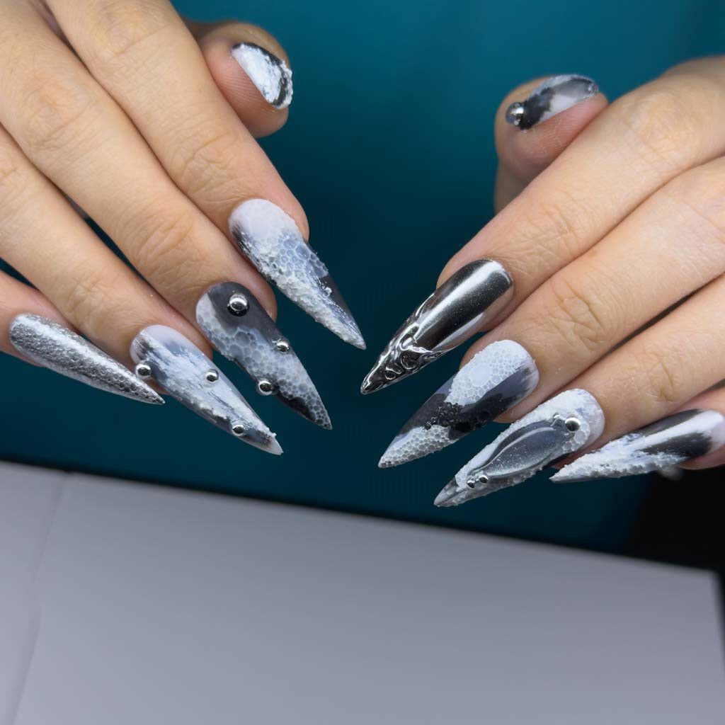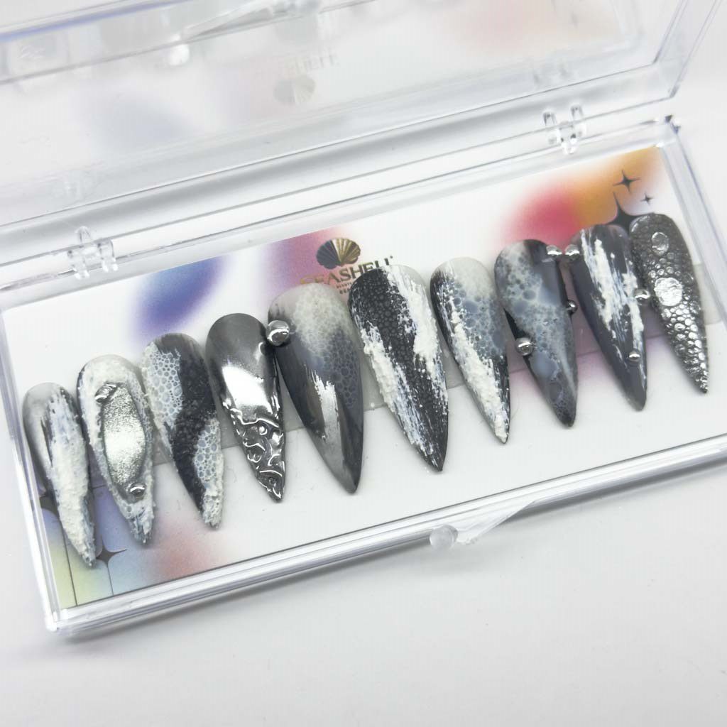 Stormy Sky is your go-to press-on nails for a dramatic and artistic look. This set features a beautiful marbling effect in black, white, and gray, reminiscent of stormy clouds. With a mix of glossy, glitter, and sculpted finishes, it’s a bold and mesmerizing set that’s perfect for making a statement.
